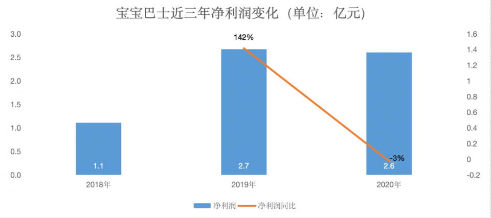 2018—2020年,宝宝巴士共计盈利6.4亿元。其中,2019年净利润为2.7亿元,较2018年的1.1亿元同比增长142%。2020年,虽然同比2019年下滑了三个百分点,但仍然实现正向盈利2.6亿元。