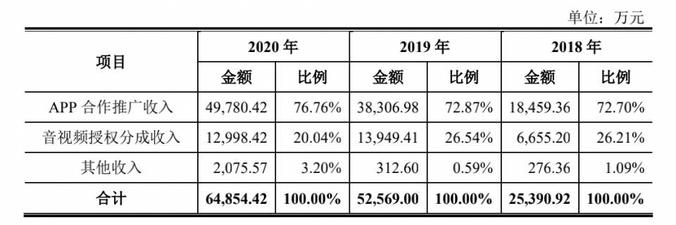 近三年以来,APP合作推广营收是绝对的主力。由2018年的1.9亿元增加至2020年的5亿元,占总营收的比重也由2018年的72.7%增加至2020年的77%。