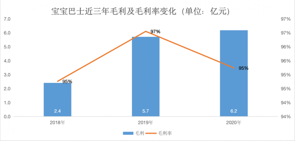 毛利润也呈现稳步增长的态势。2019年,宝宝巴士的毛利润为5.7亿元,同比增长137%;2020年,宝宝巴士的毛利润为6.2亿元,同比增长8.7%。