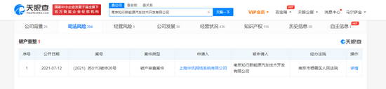 天眼查App显示,7月12日,拜腾汽车关联公司南京知行新能源汽车技术开发有限公司新增破产重整信息,案号为(2021)苏0113破申26号,经办法院为南京市栖霞区人民法院。申请人为上海华讯网络系统有限公司。