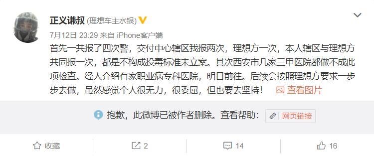@正义谦叔同时表示,对于理想水银事件,个人和理想方面均有报警,但是不构成投毒立案标准。