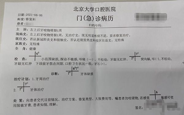 6月6日,北京大学口腔医院诊断后确认,孙先生左上后牙咬物劈裂,造成小范围缺损。据孙先生提供的照片显示,他的左上后牙有部分明显缺损。他说,由于缺损部分修补后极易再次脱落,医生建议他维持现状,且劈裂牙齿不可咬硬物,否则可能进一步开裂。