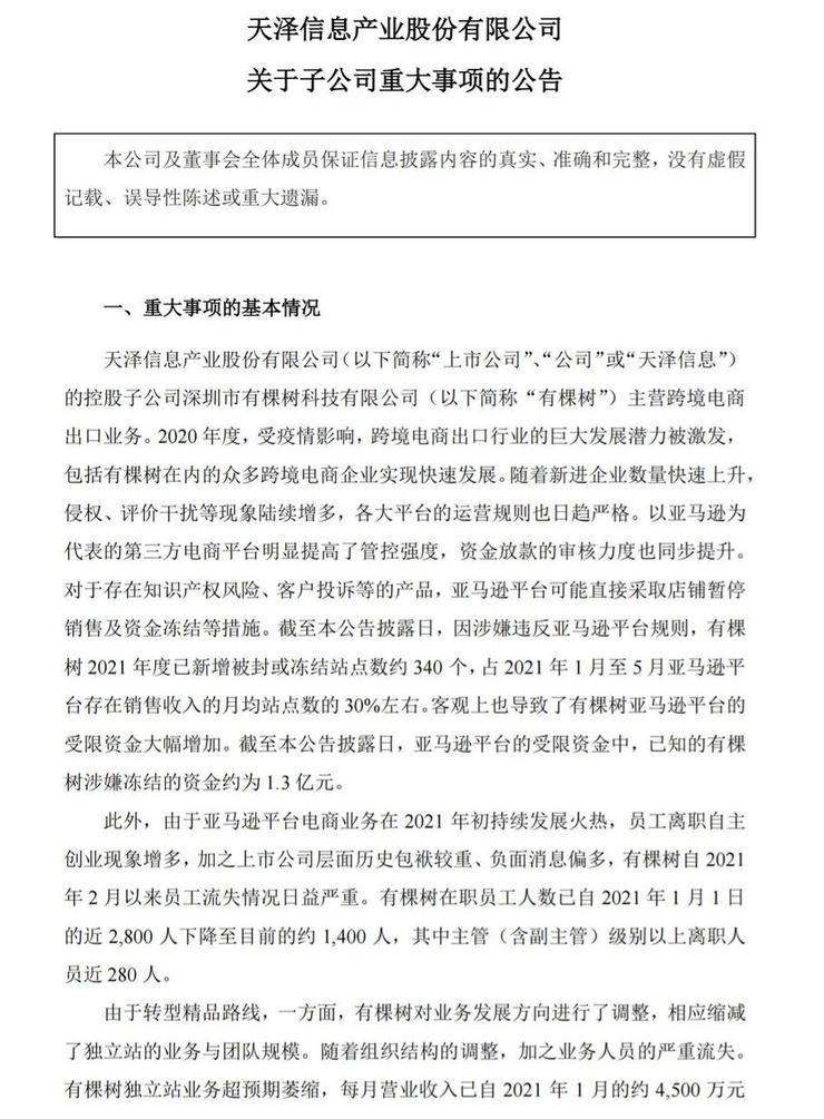 7月6日,天泽信息发布公告表示,其控股子深圳跨境大卖家有棵树因涉嫌违反亚马逊平台规则,在2021年已新增被封或冻结站点数约340个。截至公告披露日,已知的有棵树涉嫌冻结的资金约1.3亿元。
