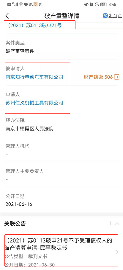 企查查信息显示,今年6月16日,苏州仁义机械工具有限公司也曾申请对南京知行旗下的南京知行电动汽车有限公司申请破产重整(2021)苏0113破申21号,但法院在6月30日裁定驳回申请。