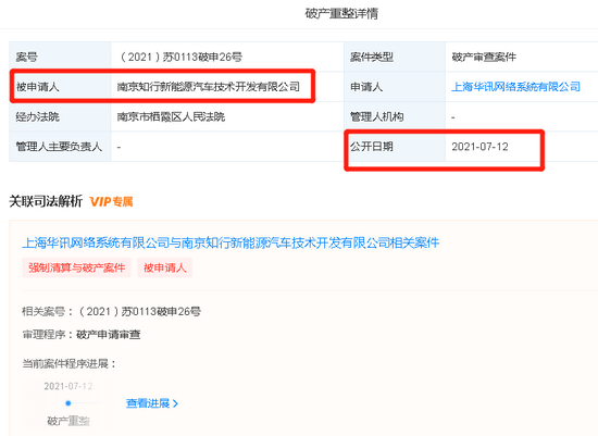 据天眼查APP显示,7月12日,拜腾汽车关联公司南京知行新能源汽车技术开发有限公司新增破产重整信息,案号为(2021)苏0113破申26号,经办法院为南京市栖霞区人民法院,申请人为上海华讯网络系统有限公司。