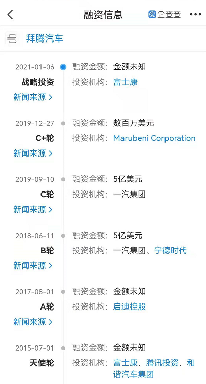 据了解,拜腾汽车先后进行了 6 次融资,投资方包括一汽集团、宁德时代(546.010,-17.00,-3.02%)和富士康等,最新一轮融资时间是今年的 1 月 6 日。其中,前四轮融资总额已达到84亿元。主要股东包括一汽集团、宁德时代等。