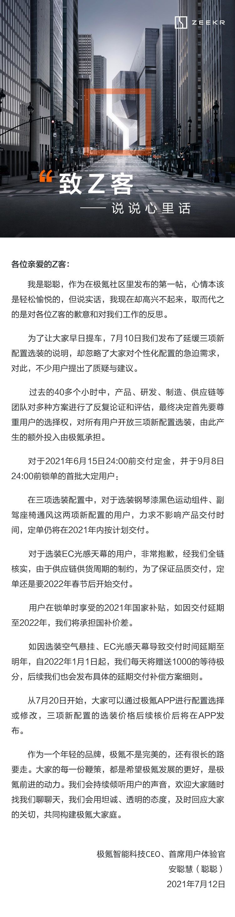 安聪慧在公开信中自称“聪聪”。其表示为了让大家早日提车,7 月 10 日极氪发布了延缓三项新配置选装的说明,却忽略了大家对个性化配置的急迫需求。对此,不少用户提出了质疑与建议。