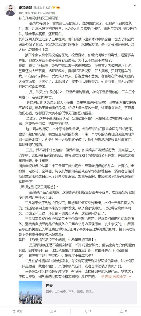 @正义谦叔表示,我不要求什么赔偿,但我希望如果确实不是后端行为,是前端进入的水银,比如来料品控有瑕疵,也希望理想和李想能给我公开道歉,并且把这脏车拉回去,退还车款。