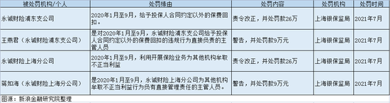 其中,永诚财险浦东支公司因2020年1月至9月,给予投保人合同约定以外的保费回扣,被责令改正并处罚款26万元;而该支公司的主管人员王燕君对该项违规行为负直接责任,被警告,并处罚款9万元。
