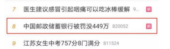 7月5日,银保监会官网披露,邮储银行因未经客户同意违规办理短信收费业务等六项违法违规行为,被银保监会合计罚没约449万元。当日,话题“中国邮政储蓄银行被罚没449万”冲上微博热搜榜。