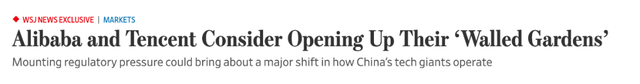 这或许是2021年互联网的最重磅消息,7月14日晚间,有报道称,中国互联网的两大巨头阿里巴巴、腾讯正在考虑互相开放生态系统。消息直接引爆了在美股上市的阿里巴巴,当晚一度大涨超3%。