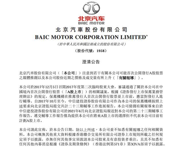 北京汽车(3.26,0.11,3.49%)在港交所发布澄清公告称,注意到若干有关本公司可能首次公开发行A股股票之媒体推测以及本公司股份近期之价格及成交量有所上升。