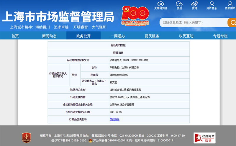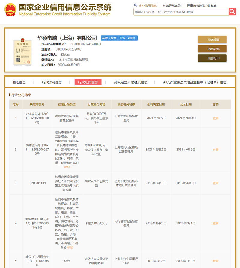 值得注意的是,国家企业信用信息公示系统显示,华硕电脑(上海)有限公司此前曾有多次行政处罚记录,多涉及广告违法等事由。