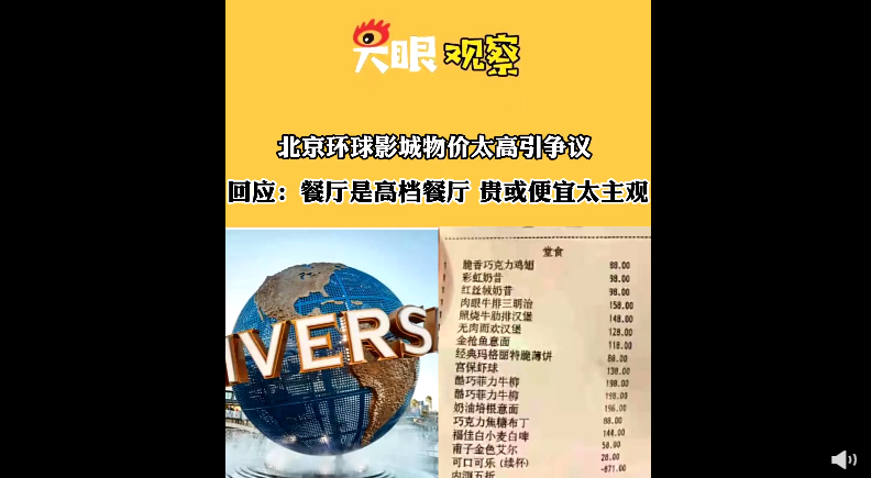 科创 北京环球影城回应物价高争议:贵或便宜太主观 2021-07-16 11:07:00 分享 来源:新浪财经7月14日,网友晒出北京环球度假区餐饮小票,小票显示各餐品物价过高。负责环球度假区公关事务的工作人员对此回应,定价是真实的,“餐价的贵或便宜主观因素比较多,很难凭借小票去评价贵或不贵。”工作人员还表示,这家餐厅是一家高档西餐厅,不是快餐店,并且这家餐厅位于环球影城外的城市大道,后期开放时不需要门票。