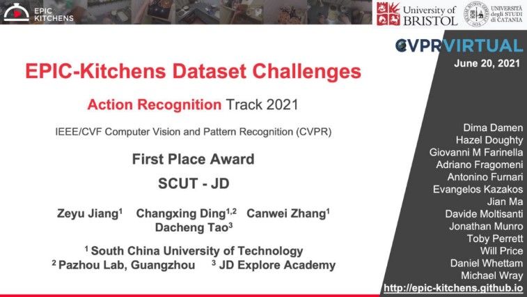 在“厨房场景下-自我中心感知、交互与计算”(EPIC-KITCHENS)大赛中,京东探索研究院联合华南理工大学,荣获“动作识别”任务第一名。参加该竞赛的队伍包括:英国伦敦玛丽女王大学、西班牙巴塞罗那大学、新加坡国立大学等知名高校以及意大利布鲁诺凯斯勒基金会、三星人工智能中心等知名组织和企业研究机构。“厨房场景下-自我中心感知、交互与计算”大赛要求识别动作和名词构成的行为对,其任务需要识别的动作类别众多,且数据集具有长尾数据分布、小样本、零样本等问题,给选手带了巨大的挑战。