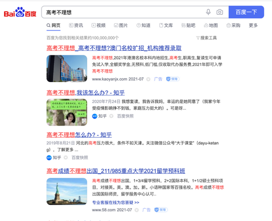 如果你高考成绩实在不太理想,也不用着急,在百度输入“高考不理想”,首页首屏前5条全部都是解决方法:有各种“保证成绩提升”的复读学校、有劝你“上不了一本可以出国留学”的中介机构、也有“免试无预科、直接录取”的港澳名校本科直通车。