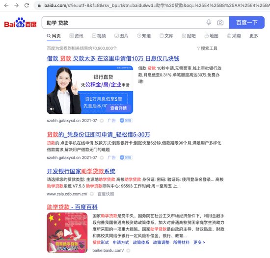 如果你被高校录取但是家中条件不好想要申请贷款,在百度搜索“助学贷款”,头条是“申请10万,日息仅几块钱”的链接;二条是“凭身份证即可申请轻松借5-30万”的广告,真正的国家助学贷款条目和申请界面则被挤到了下面。