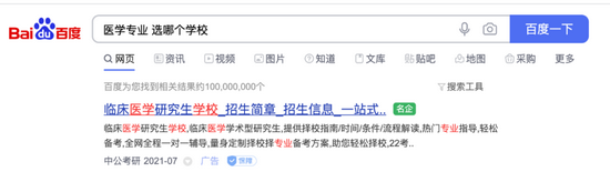 搜索“教育学排名”、“医学专业选哪个学校”等对报考有参考意识的信息时,百度呈现的内容无一例外都是广告优先,而真正有用的信息往往被挤到了不显眼的位置。