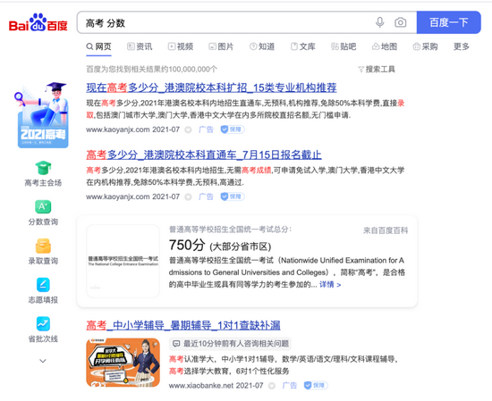 在这个搜索结果首页首屏的前四条中,只有第三条百度百科的内容才和高考分数有关,其余的第一条、第二条、第四条均是推广广告。