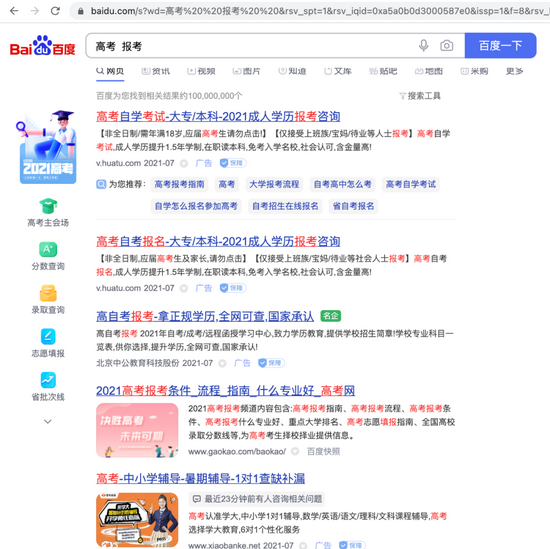 一般来讲,查完分就是填报志愿了。在百度搜索“高考报考”,呈现结果的情况更为离谱。首页首屏的目力所及全是广告,这些网站主要集中在成人教育和自学考试的招生类上。