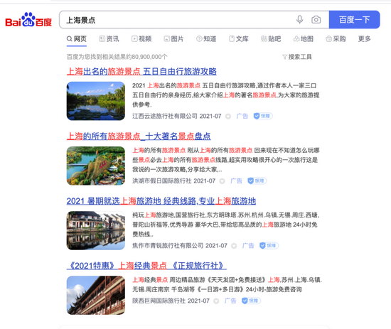 每年的暑期也是学生旅游的旺季。如果考试完了,想出去散散心,用百度搜索城市名+景点,你就会发现低团费的旅行社几乎全集中在了百度上。搜索“上海景点”,你别想能轻易看到真正的上海景点介绍,这个搜索结果的首页显示中,除了前5条全是广告外,第2页、第3页也夹杂了大量广告。这些广告的信息是由一些你平时可能都没听过名字的各地小旅行社投放的,而点开这些链接,对当地旅游产品的介绍中,除了导游和旅行社的名字不同以外,文案部分大同小异,指向的景点和线路也基本都是雷同的。