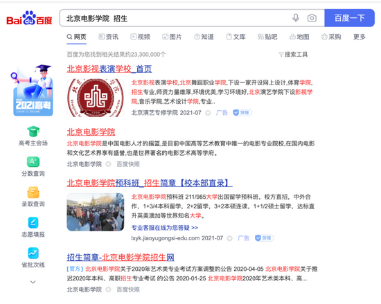 如果你想查一下你中意的一些大学或专业的招生信息,百度主要提供的信息也几乎都是推广广告。搜索“北京电影学院招生”,首条内容是一家名为“北京影视表演学校”的网站链接。