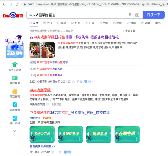 搜索“中央戏剧学院招生”,放在第二条的中央戏剧学院的链接被第一条和第三条的广告夹击,特别是第一条内容,以类似于“中央戏剧学院招生简章”字样来引导点击。