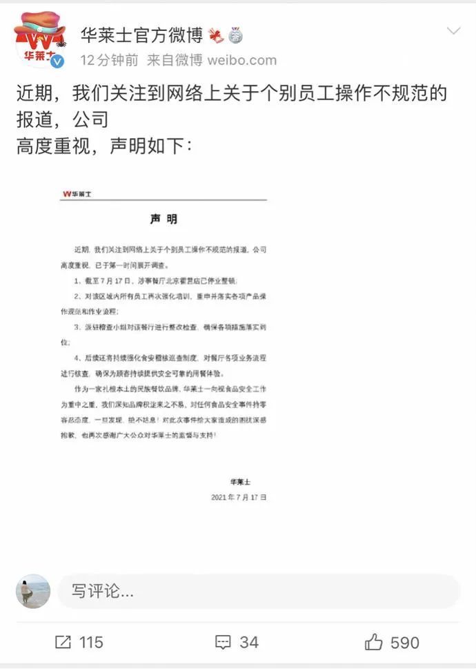 7月17日晚间7点多,华莱士通过官方微博作出回应,称其近期关注到网络上关于个别员工操作不规范的报道,公司高度重视,已于第一时间展开调查。截至7月17日,涉事餐厅北京霍营店已停业整顿。
