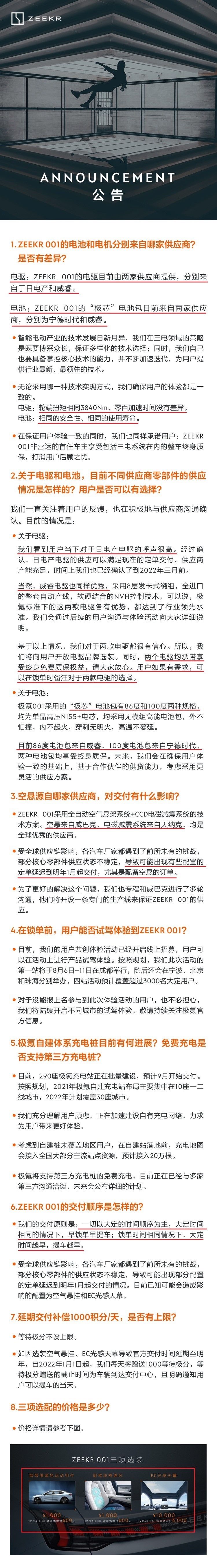 针对车主的疑问,极氪官方在极氪APP上发布公告回应,公告中针对车主对极氪001电机/电池供应商、悬架供应商、充电体系、交付顺序、交付补偿、选配价格等疑问进行了答复。具体公告内容如下: