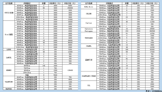 据拍品清单显示,该批丝巾共有149条。其中,有一条为该品牌的仿品丝巾,评估价格在250元;116条为无法鉴定真伪的90*90厘米丝巾,评估价格为700元;其余32条为正品丝巾,长款均为90厘米、70厘米或40厘米,还有一条为135*130厘米,评估价格分别为1600元、1500元、700元及5500元。