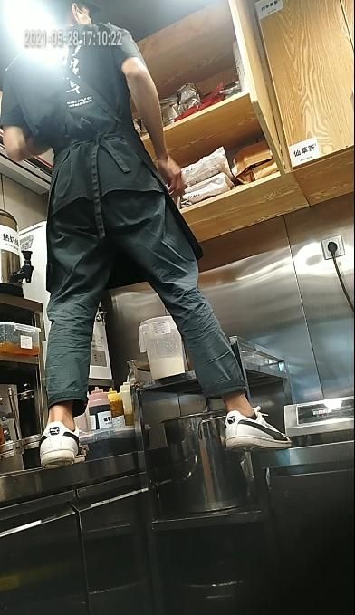 店内消费者络绎不绝,前面店员在迎客,然而操作间里店员多次脚踩操作台寻找物品……这是发生在书亦烧仙草门店内的情景。