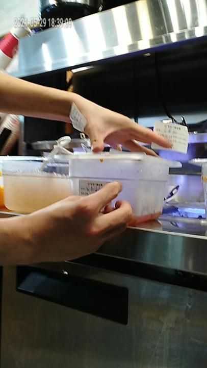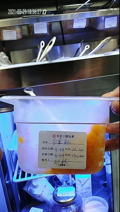 珍珠、西米、芒果粒、橙子、柚子、芋圆、芋泥、红茶等是该门店常用的食材,在公司的标准里,它们有不同的安全保质期规定,但实际上只要不严重变质,这些剩下的食材就会被继续使用。如5月29日剩余的芒果粒、西米、葡萄等,被撕下当日标签,贴上新一天的标签。