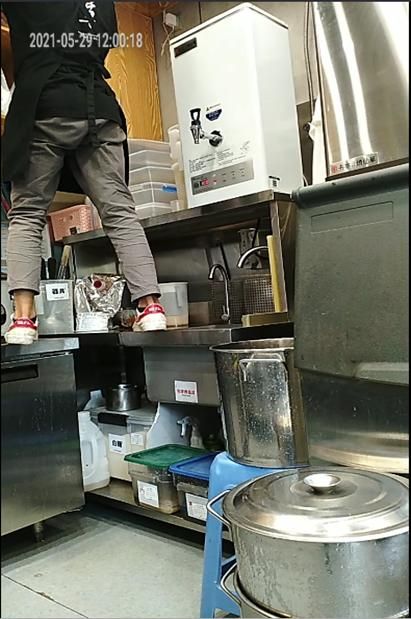 令调查人员感到夸张的是,这样的情景有时一天之内多次上演。在店员脚边摆放的是用于加工茶饮的物料,店员跳下后也未对操作台进行清洗。