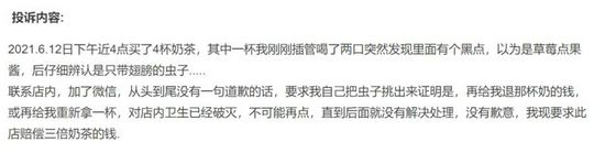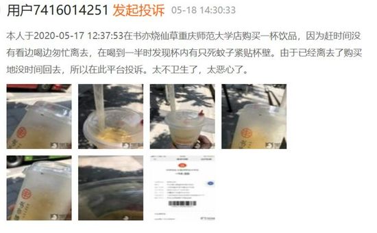中国质量新闻网注意到,就食品安全问题,书亦烧仙草曾收到过多起投诉。去年5月,有消费者在重庆师范大学店内购买了一杯烧仙草,喝到一半时发现杯内有只死蚊子紧贴杯壁;今年6月,夏女士在外卖书亦烧仙草内喝出飞虫,开始以为是草莓果酱,仔细辨认后发现是带翅膀的黑虫;还有消费者反映喝完书亦烧仙草拉肚子罹患肠胃病。此外,书亦烧仙草也有被消费者投诉存在偷工减料、店员服务态度不佳的现象。