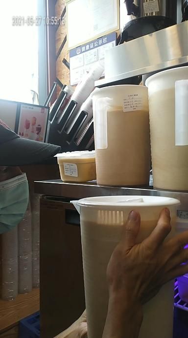 5月27日一早,调查人员来到店内,看到店员在备餐过程中,先将昨日剩余的烧仙草奶茶换贴新保质期,又将暂时不用的三大桶放进冰箱。按规定,烧仙草奶茶(热)保质期4个小时,烧仙草奶茶(冰)保质期24个小时,根据时间推算,此前剩余的烧仙草奶茶应被处理掉。不过,门店显然是为了节省开支,过期奶制品往往不会被丢弃,当消费者购买时,店员将其重新倒入保温桶,用以调制售卖。