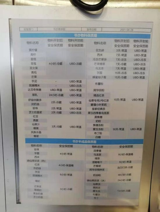 不过,在广西南宁青秀万达书亦烧仙草门店,调查人员发现,店内虽张贴着物料保质期限章程,但这些标准形同虚设。