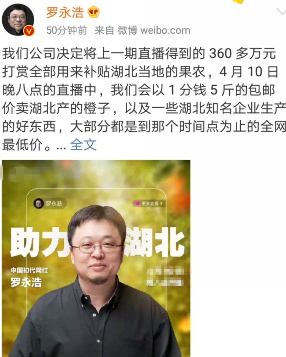 去年的疫情期间,罗永浩在一次直播中收到粉丝360多万元的打赏。随后,罗永浩宣布将这部分收入以补贴的方式全部捐给湖北果农。