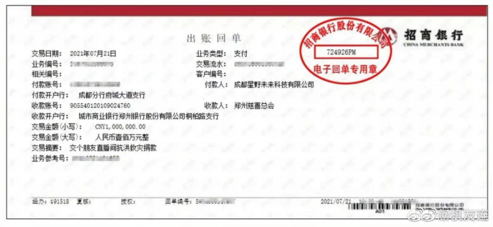根据公布的出账回单显示,该笔资金的付款人为成都星野未来科技有限公司,交易摘要中写道:交个朋友直播间抗洪救灾捐款。