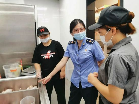 禾山市场监管所执法人员在华莱士门店后厨进行检查