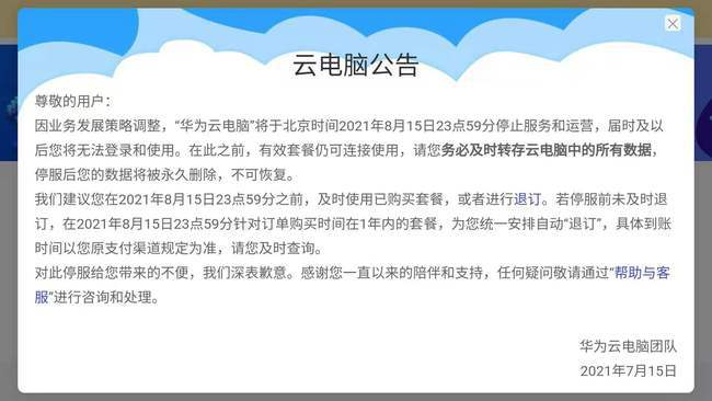 炣燃科技7月22日讯(江丞华)7月22日消息,华为云电脑团队发布公告称,因业务发展策略调整,云电脑将于2021年8月15日23点59分停止服务和运营,以后用户将无法使用,停服后,用户的数据将被永久删除,不可恢复。
