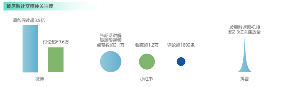 京东超市发布的《2021水饮行业创新趋势报告》中指出,从社交媒体上来看,玻尿酸已经逐渐走热,无论是微博、小红书或是抖音,玻尿酸均有相当讨论度。小红书有关“玻尿酸”的笔记已经超过53W,商品数量也超过了1W。而搜索“玻尿酸饮料”笔记也超过了2500篇,“肌肤真的可以变好”“元气水光肌的秘密”等是玻尿酸饮料的主打功效。