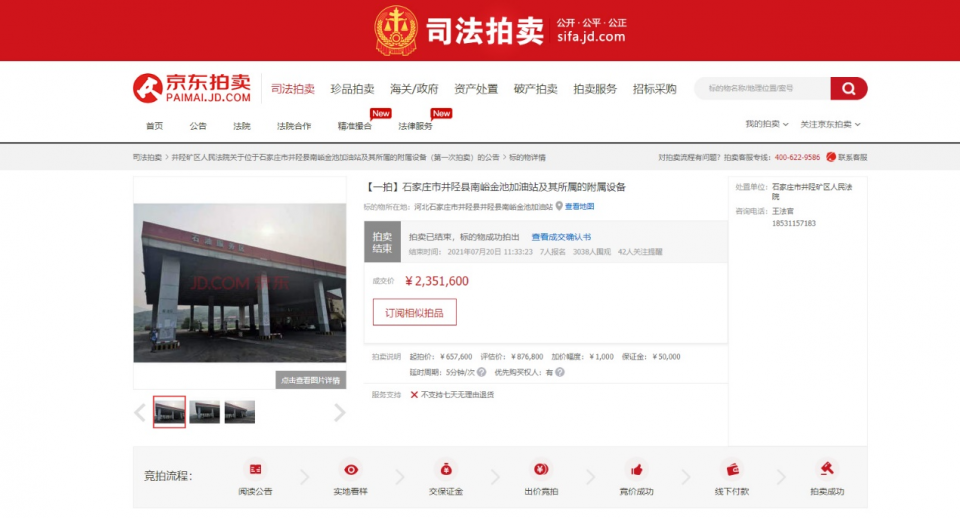 近日,就有人经过多达125次的竞价,在京东拍卖成功拍下石家庄市井陉县南峪金池加油站!更值得一提的是,这座加油站起拍价65.76万元,最终成交价则高达235.16万元,溢价率高达近3.6倍!