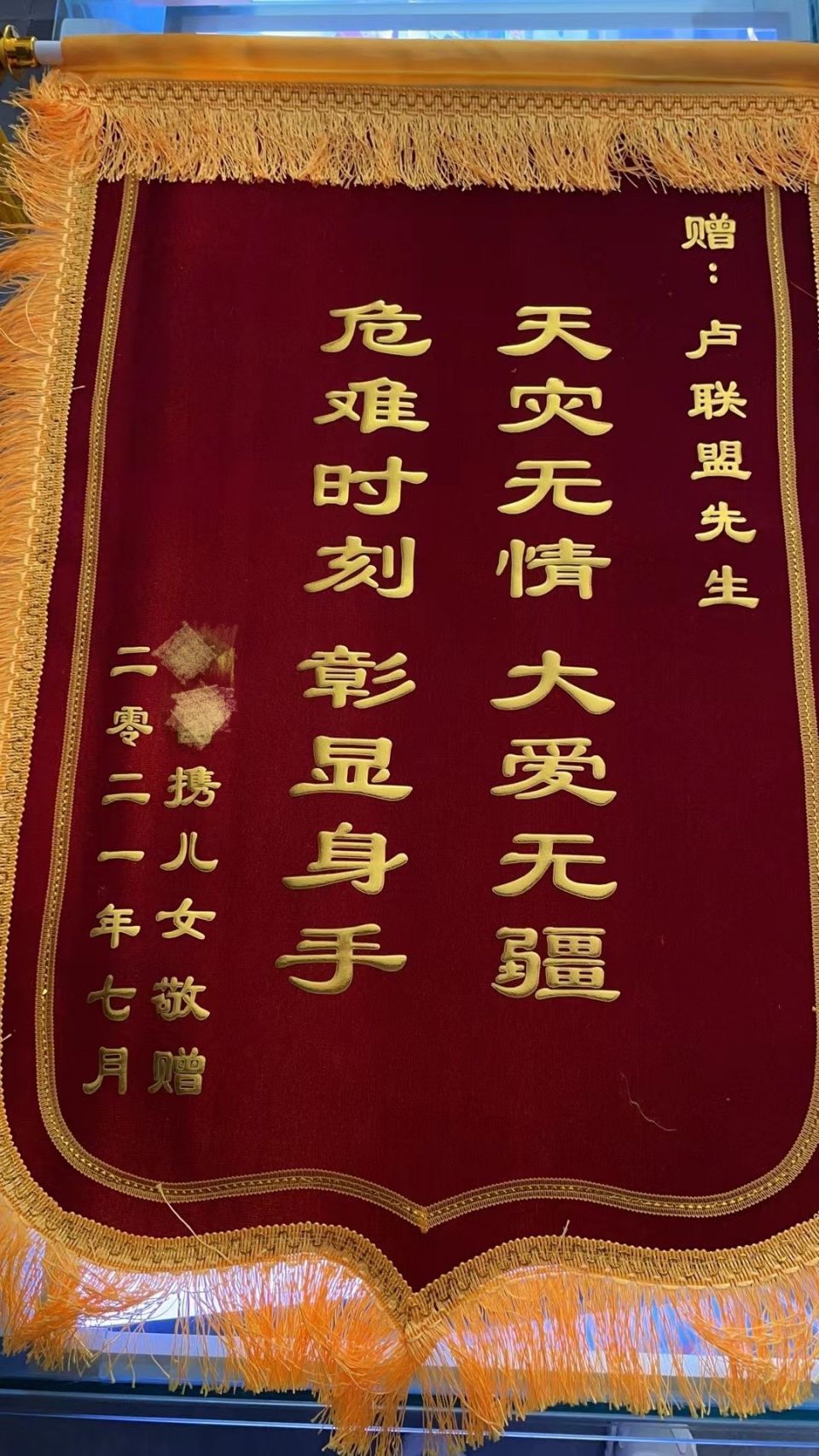 (被救者家属给京东便利店店主卢联盟送锦旗)