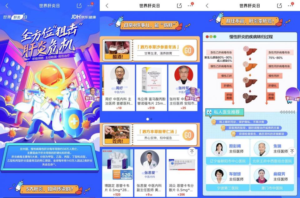 为了帮助大众更好地了解肝炎,更便捷地防治肝炎,今年世界肝炎日期间,京东健康全面开启了“全方位‘狙击’肝炎危机”专题行动,携手业内一线专家打造肝炎防治专区,通过全方位的肝病防治指南、名医直播、专家1元问诊、疫苗预约等服务保障用户肝健康。用户只需在京东或京东健康APP搜索“世界肝炎日”,即可直接进入活动专区。