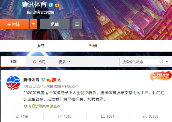 炣燃科技7月29日讯(安迪)7月28日深夜,腾讯体育在官方微博发布致歉声明称,在东京奥运会体操男子个人全能决赛后,腾讯体育发布文章用词不当。我们在此诚挚致歉,后续我们将严格把关,加强管理。据悉,东京奥运会体操男子个人全能决赛中,中国选手肖若腾以88.065分摘得男子个人全能银牌。另一位中国选手孙炜以87.798分获得第四名。日本选手桥本大辉14.700分,获得冠军。