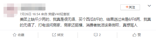 不仅大虾,还有消费者反映美团优选上的其他商品也存在缺斤少两、质量差等问题,涉及蔬菜、水果等。有网友称:“美团上缺斤少两的,我真是很无语,买个西瓜8斤的,结果送过来是6斤8两。”