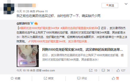 炣燃科技7月30日讯(李琳)近期,媒体报道湖北武汉一名律师在美团优选平台上购买的龙虾尾重量不足,网页中标注为1000g/袋的龙虾尾实际只有344g,其余均是冰水。