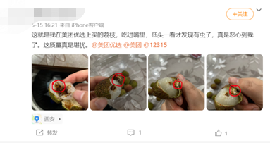 还有网友吐槽在美团优选上购买的荔枝吃到了虫子。