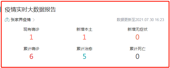 根据最新的疫情实时大数据显示:截止目前,张家界累计确诊6例,其中一例还是近日确诊的。