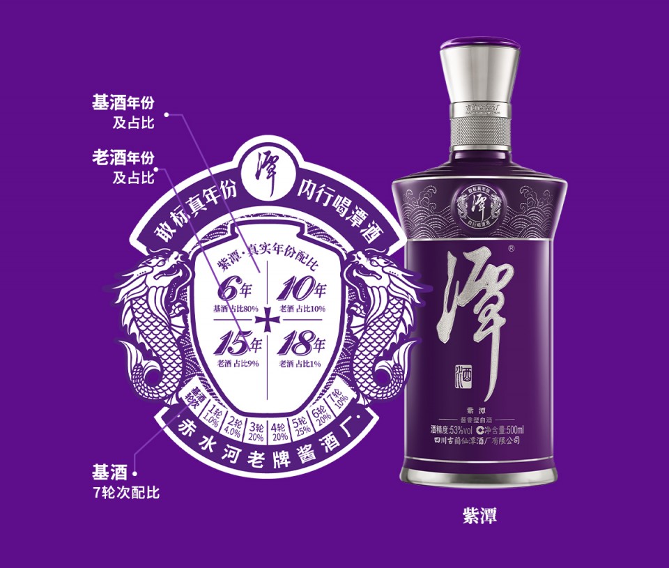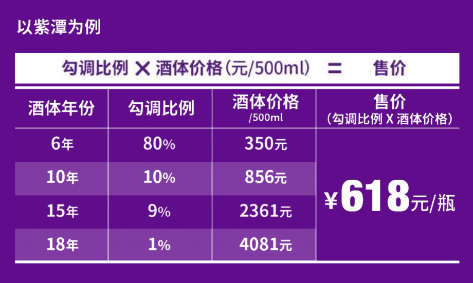 潭酒此次入驻京东超市,带来了赤水河畔最好的最真诚的真年份家族6款产品,分别是:银酱、金酱、红潭、红得发紫、紫潭、紫气东来,价格从120元-1256元不等,每一瓶产品瓶身上都有公开标注基酒、老酒酒龄及配比,更将酱酒7轮次配比也透明展示,每款都有中国酒业协会认证的年份酒编号。同时,潭酒的每款产品价格,都是按酒体酒龄及比例算出来的,以紫潭为例:
